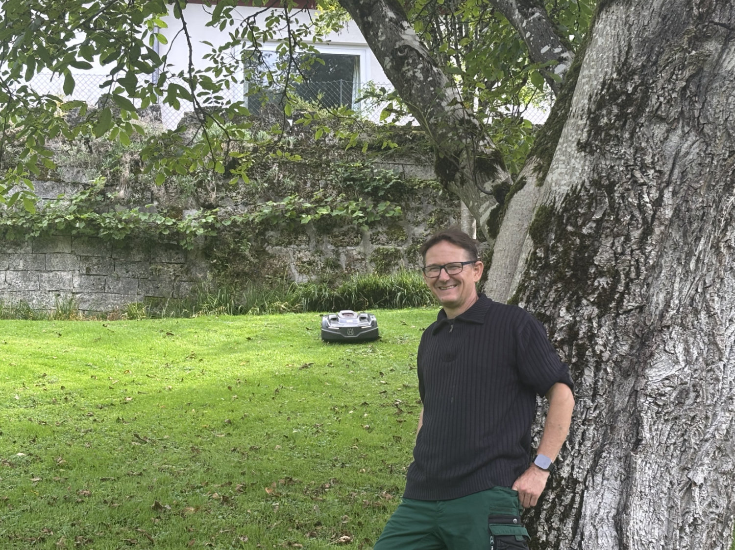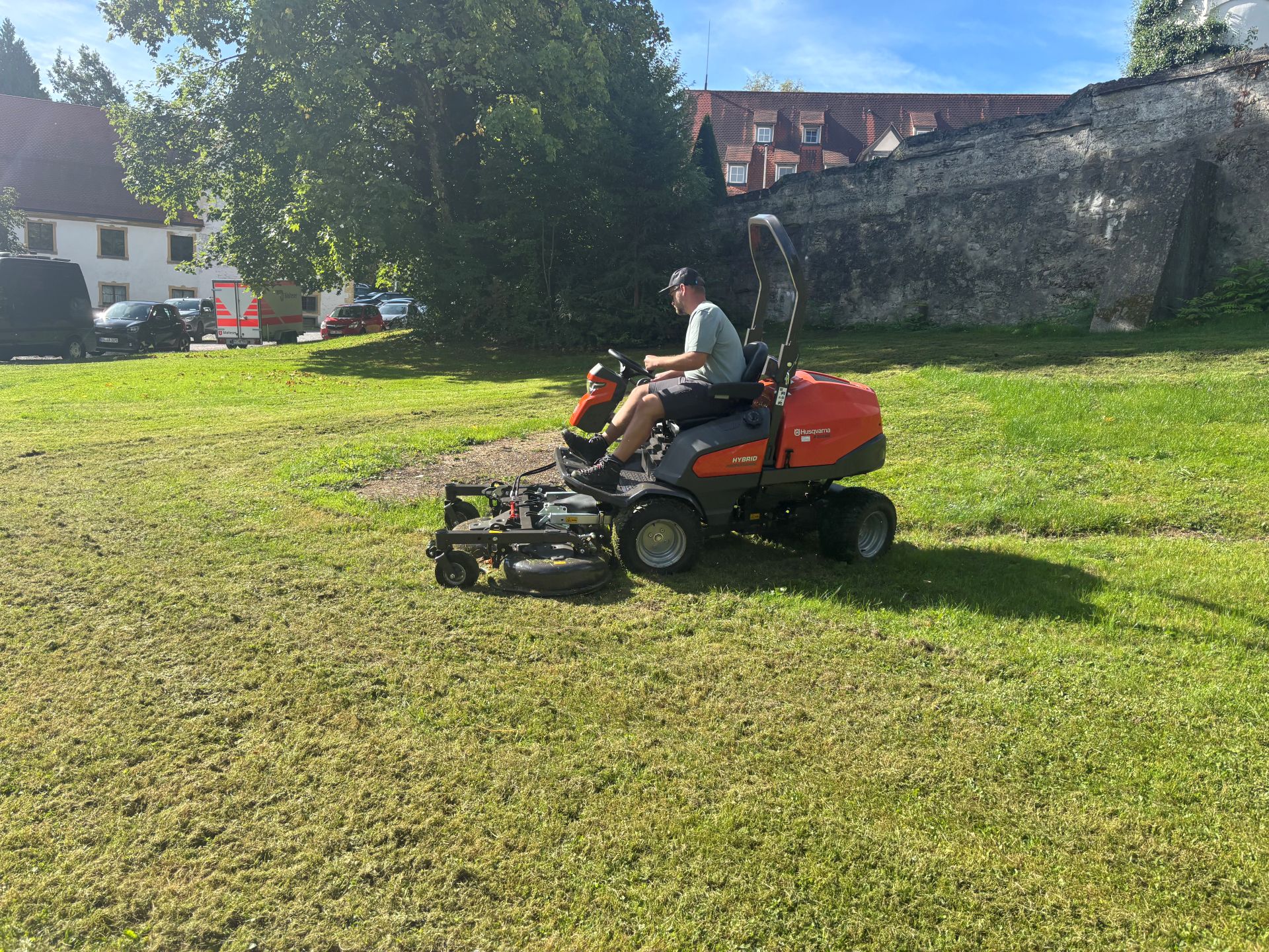 Der Einstieg begann im vorderen, ebenen Bereich mit zwei kleineren Mährobotern – das Ergebnis überzeugte sofort. Bald folgte die nächste Herausforderung: die steileren Hänge hinter dem Schloss. Gemeinsam testeten wir einen Allrad-Mähroboter – mit großem Erfolg.